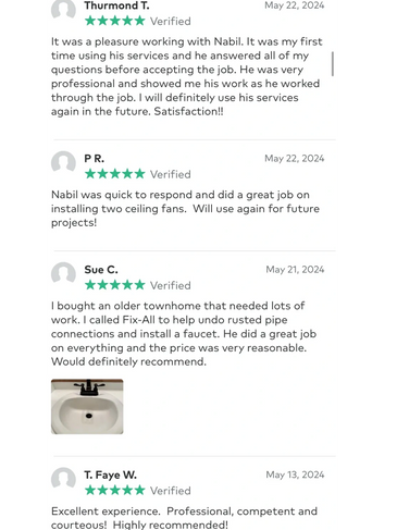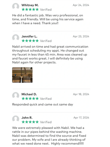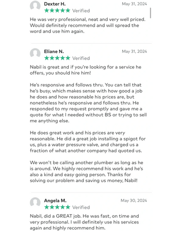 Welcome, My Name is Nabil I started as a painter in 2016, two years later started in the world of plumbing (residential and commercial experience). In 2022 I decided to take a big step in my career and started my own business, since the day I took that decision, I haven't stop working to meet customer expectations.